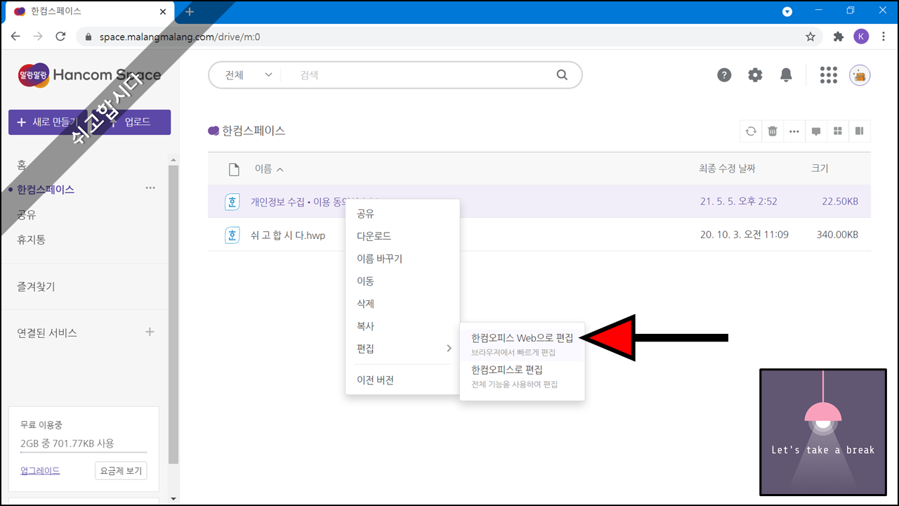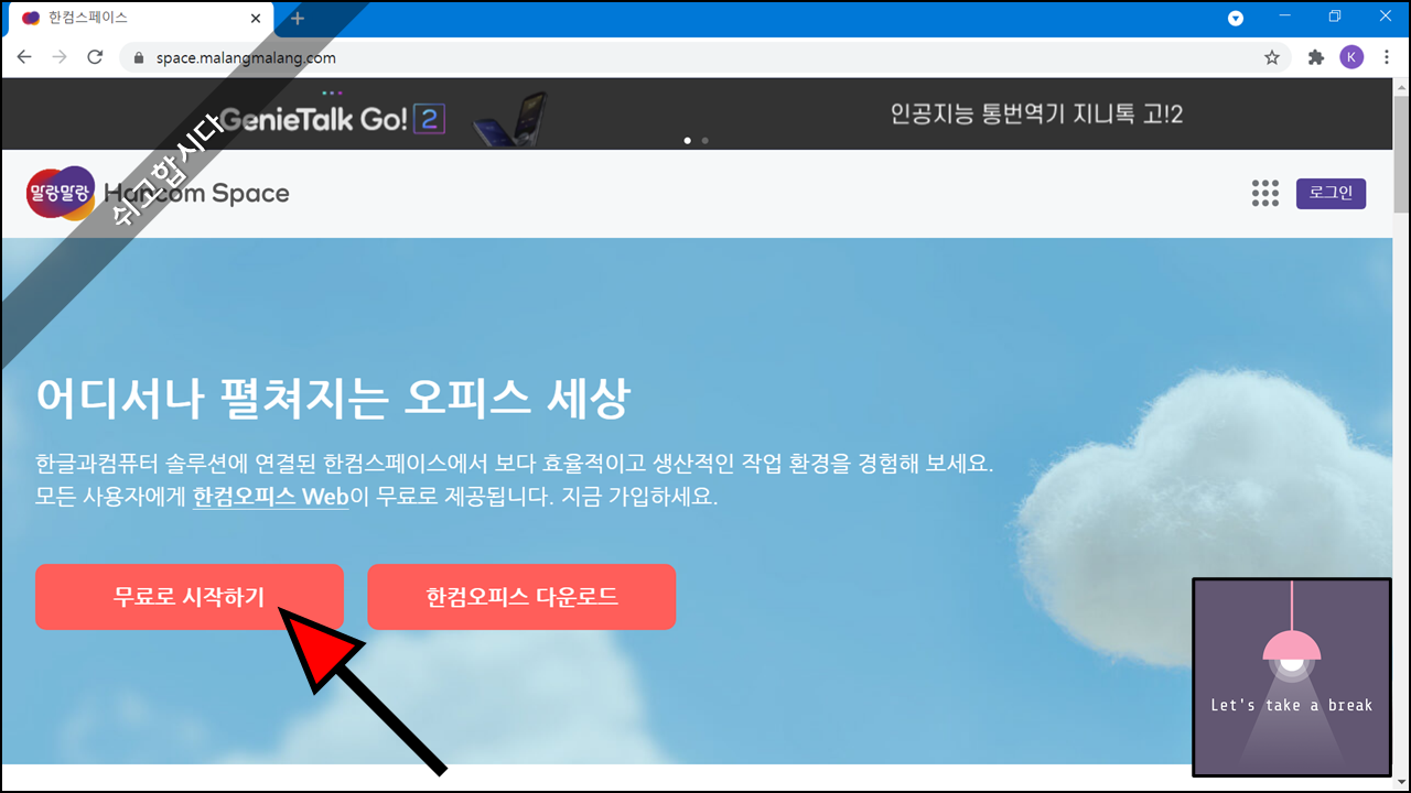 한컴 스페이스에 접속하여 무료로 시작하기를 클릭합니다.