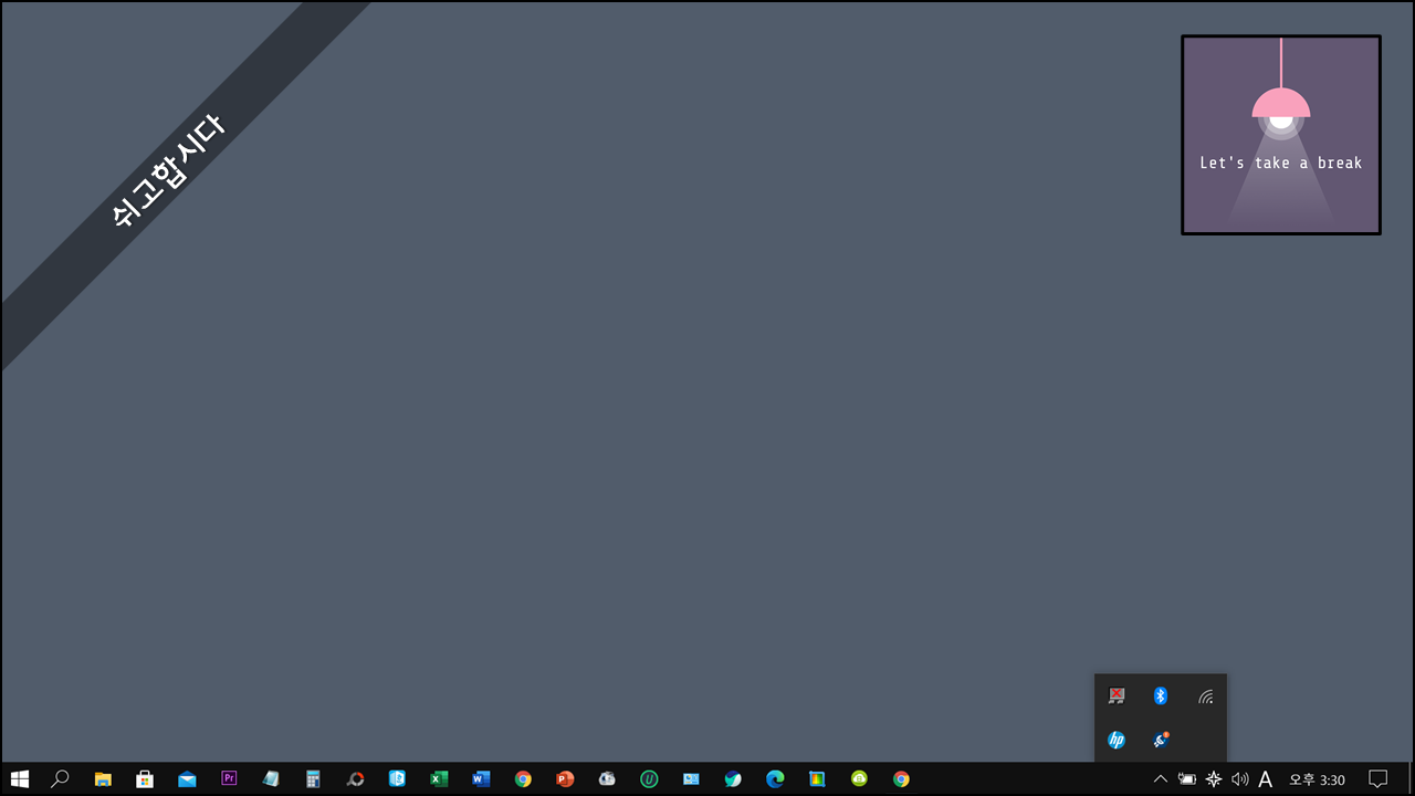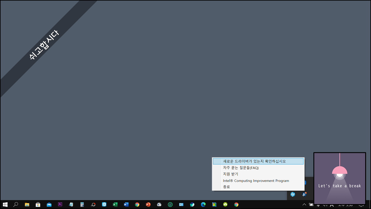 8. 컴퓨터가 다시 시작하여 윈도우로 진입하면 작업표시줄 트레이에 추가되어 있는 드라이버 및 지원 도우미 아이콘을 마우스 오른쪽 버튼으로 클릭합니다.