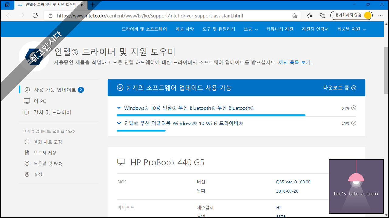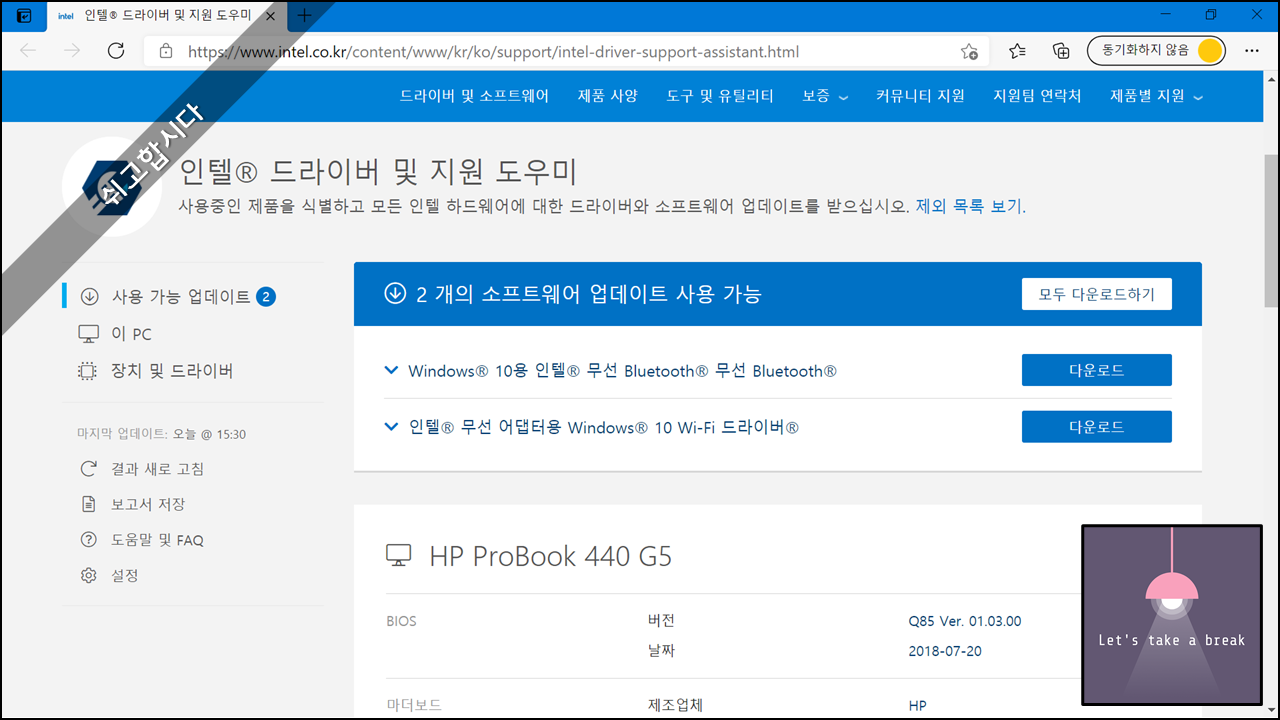 10. 인터넷 창이 열리면서 인텔 드라이버 및 지원 도우미 페이지로 연결됩니다. 아래 그림을 보면 알수있듯 2개 업데이트 가능한 드라이버 목록이 표시됩니다. 제가 블루투스 사라짐 현상이 나타났던 이유가 블루투스 관련 드라이버가 최신버전이 아니였음을 추측할 수 있습니다.