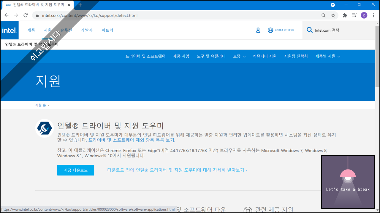 3. 지원 페이지로 이동하면 인텔 드라이버 및 지원도우미 제목 하단에 다운로드를 클릭하여 설치파일을 컴퓨터로 다운로드 받습니다.