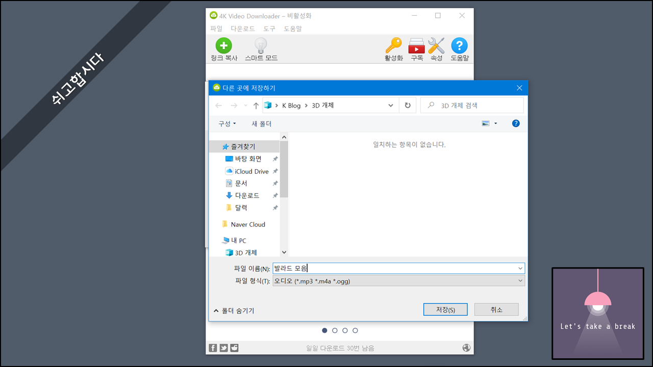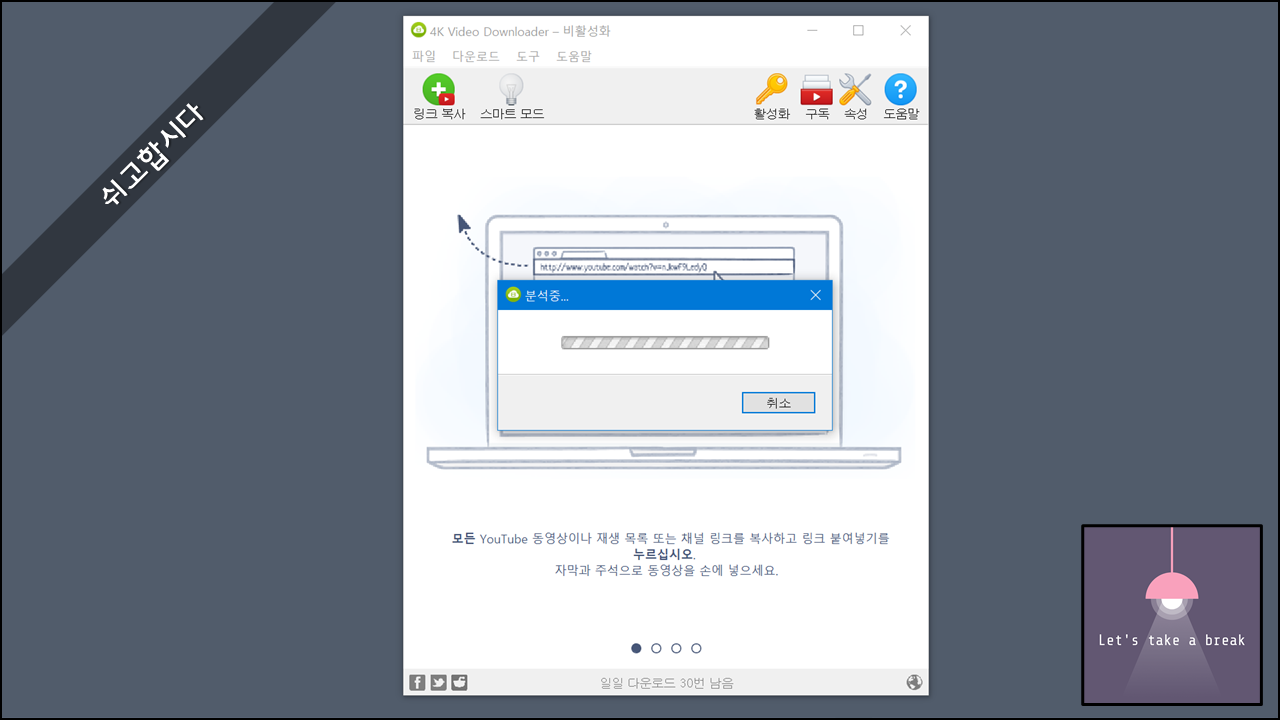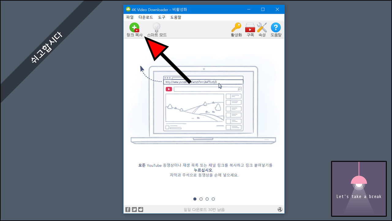 4K Video Downloader는 무료버전과 유료버전으로 구분되어 있으며 무료버전에는 일일 다운로드 횟수 제한이 있습니다. 하루 30번까지는 무료이기 때문에 동영상 다운로드 수가 많은 사용자가 아니라면 부담없이 사용할 수 있습니다.
