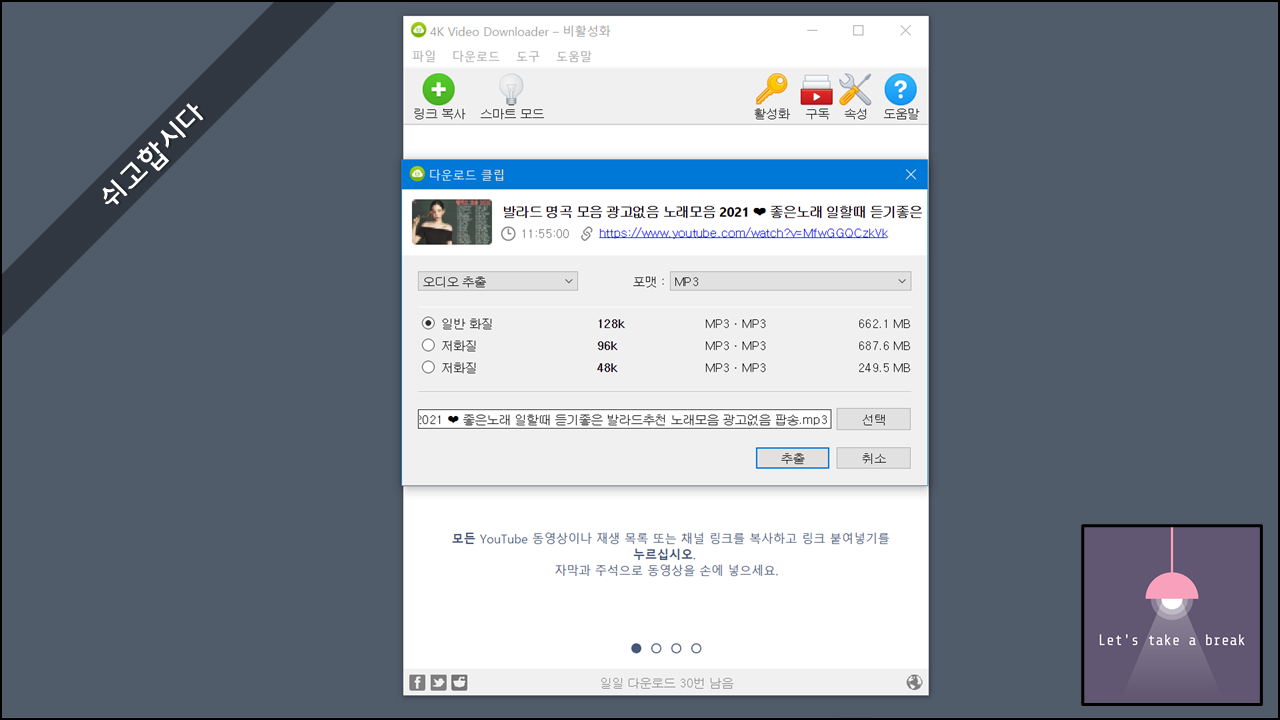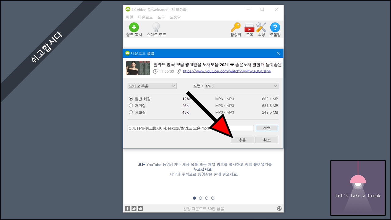 10. 모든 준비 완료후 추출을 클릭하면 다운로드가 시작됩니다.