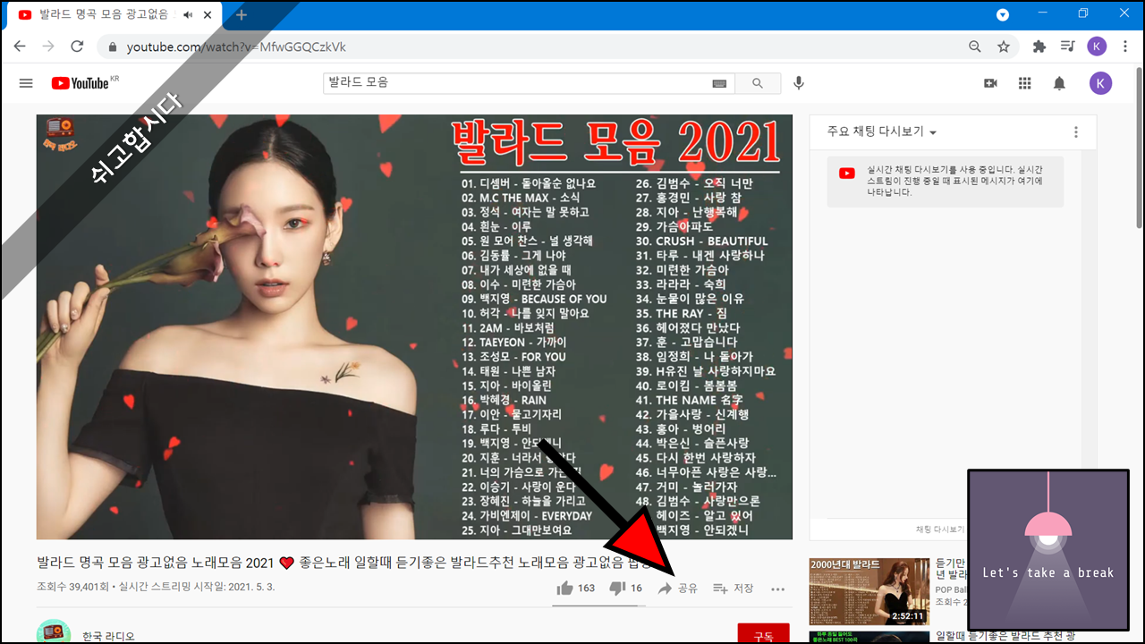 2. 유튜브에저 PC로 저장할 동영상을 클릭하여 재생페이지로 이동합니다. 동영상 박스 오른쪽 하단을 보면 화살표 모양의 공유 아이콘을 클릭합니다.