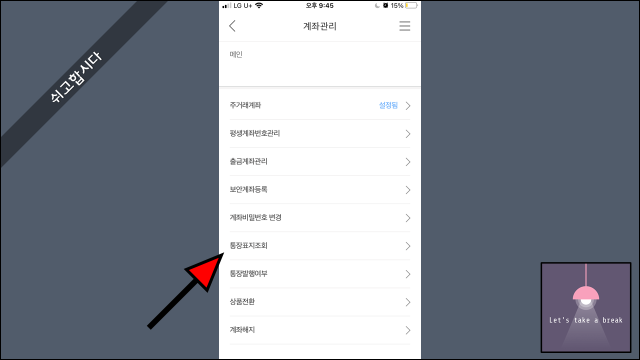 4. 계좌관리 목록에서 통장표지조회를 터치합니다.