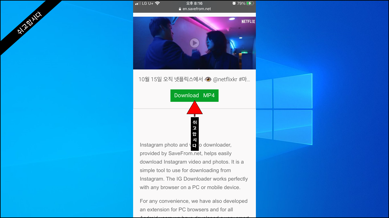 ▶다운로드 버튼을 터치하면 인스타그램 동영상을 아이폰으로 저장할 수 있습니다.