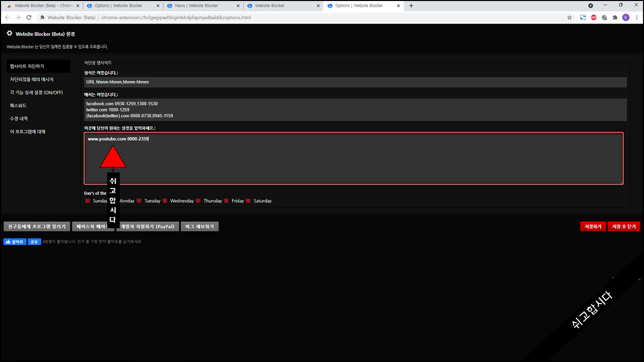 ▶️옵션의 '이 곳에 당신이 원하는 설정을 입력하세요' 항목을 보면 사용자가 차단한 사이트 목록이 표시됩니다. 그 목록에서 차단을 해제하고 하는 사이트를 지우고 저장하면 해당 사이트 차단이 풀립니다.