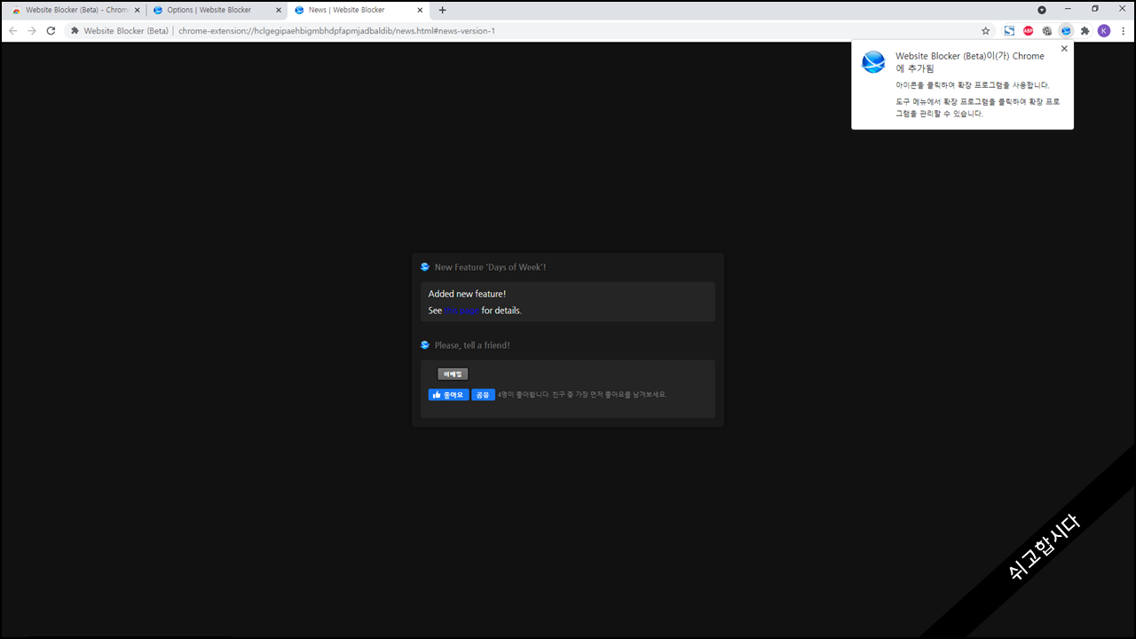 ▶️Web Site Blocker 확장 프로그램 추가가 정상적으로 이루어지면 아래 그림과 같이 아이콘이 추가됩니다.