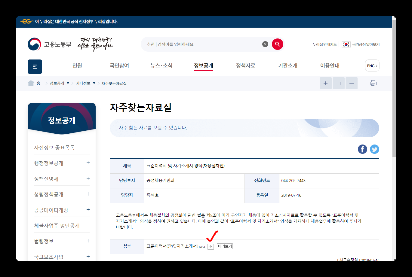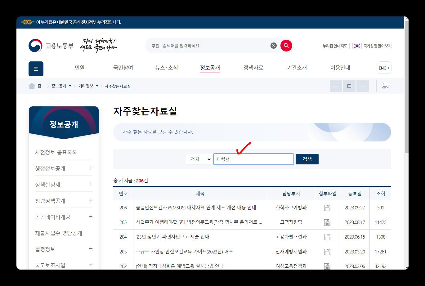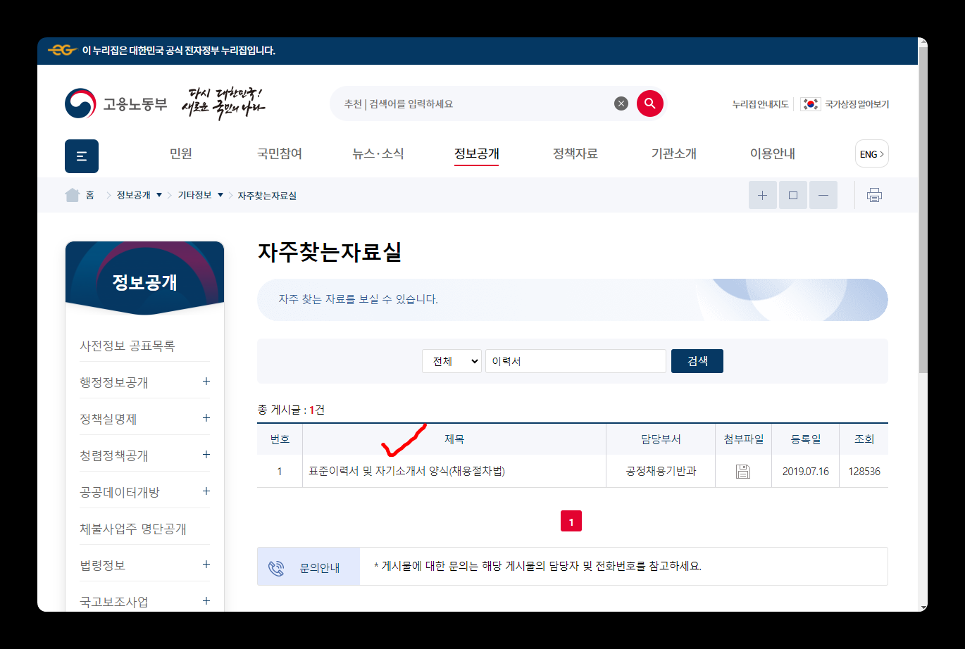 고용노동부에서 배포하는 표준이력서 양식은 [정보공개 → 자주찾는 자료실]을 통해서 원본 표준이력서 양식을 다운로드 받을 수 있습니다. 고용노동부 홈페이지에 접속한 후 [정보공개 → 자주찾는 자료실]을 클릭합니다.