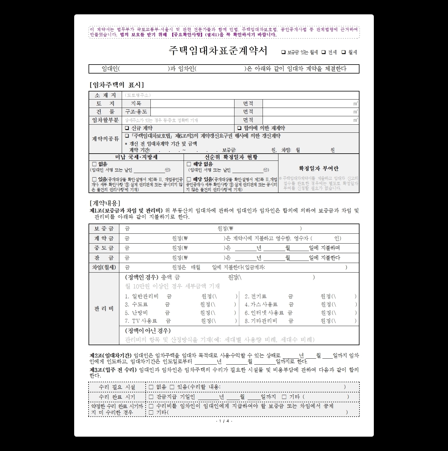포스트에 업로된 버전은 최근 개정된 버전으로 주택임대차 계약시 확인해야 하는 사항인 세금체납여부, 계약의 종류(신규 또는 재계약), 관리비 세부내역, 수리가 필요한 항목 등으로 구성되어 있습니다.