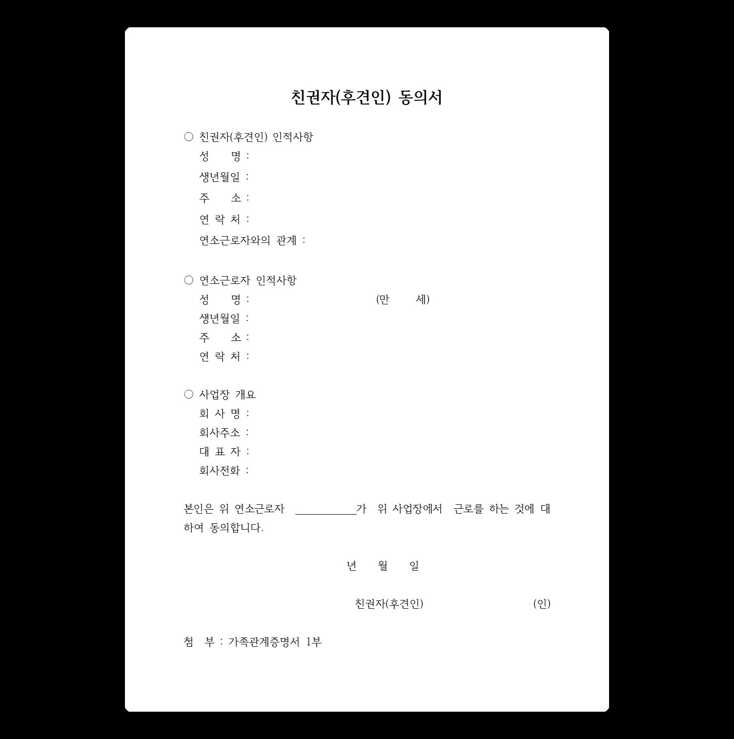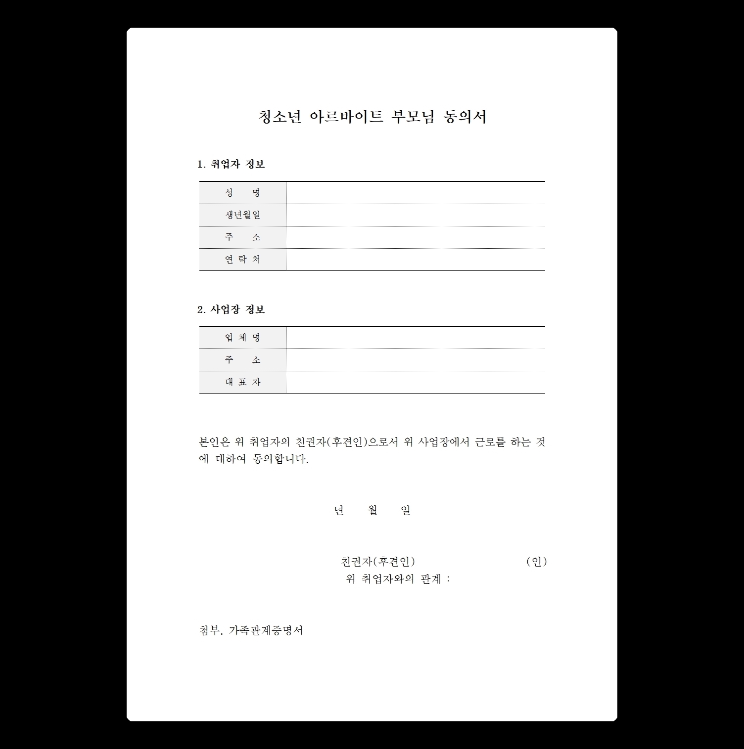 만 15세 이상 ~ 만 18세 미만의 청소년은 부모님 동의서+가족관계증명서를 준비하면 알바에 지원할 수 있지만, 만 13세 이상~ 만 15세 미만의 청소년은 친권자(부모님)+학교장이 동의하고 취직인허증을 발급받은 경우에만 특별히 아르바이트를 할 수 있습니다.