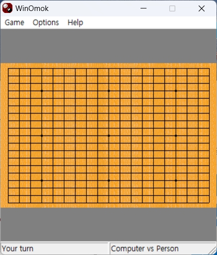 아래 그림과 같이 윈오목이 시작되면 게임 - 시작 버튼을 클릭하여 컴퓨터 오목 게임을 즐길 수 있습니다.